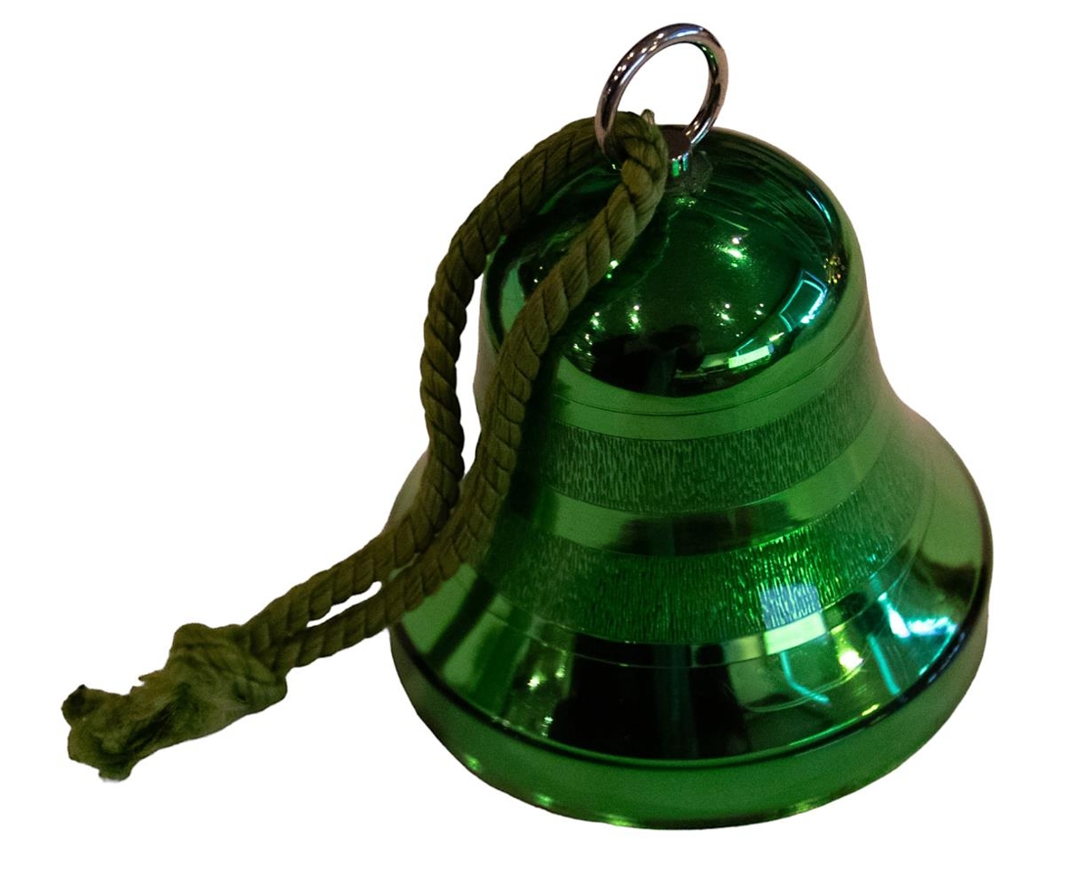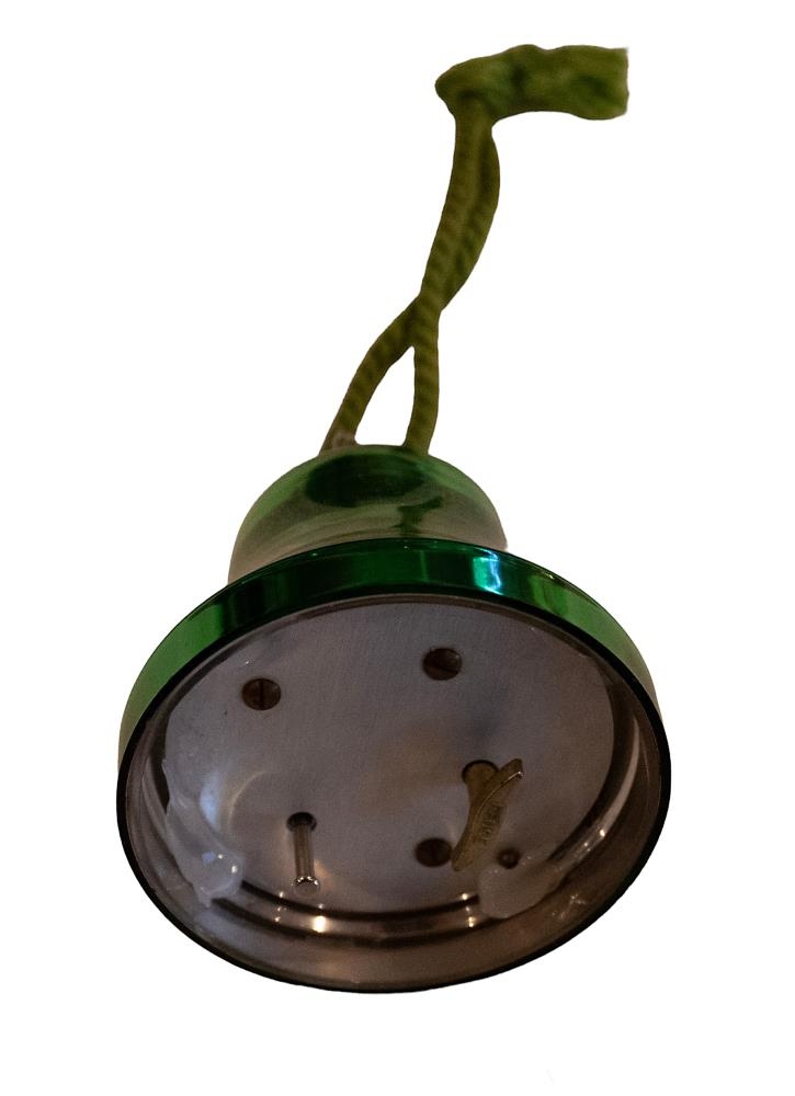 Græn jólabjalla sem er trekt upp og spilar jólalag.