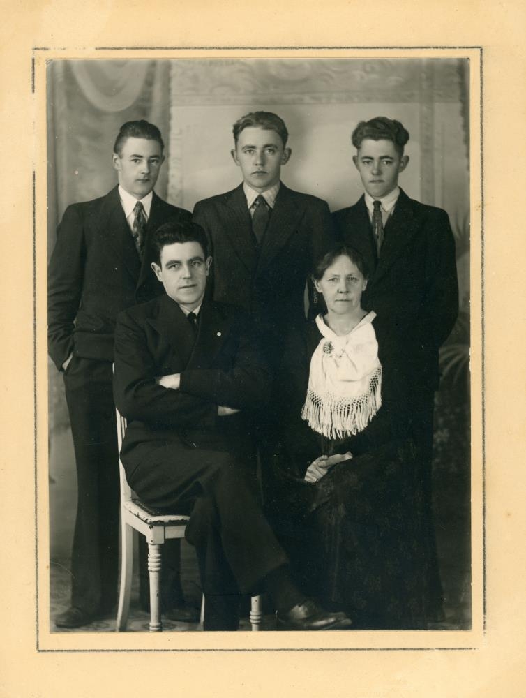 Magnea Guðrún Ísaksdóttir frá Nýjalandi í Garði með sonum sínum. Standandi frá vinstri: Hjálmar Óskar, Sigurður Björgvin, og Magnús Magnússynir. Sitjandi: Ásgeir Magnússon og Magnea.