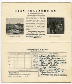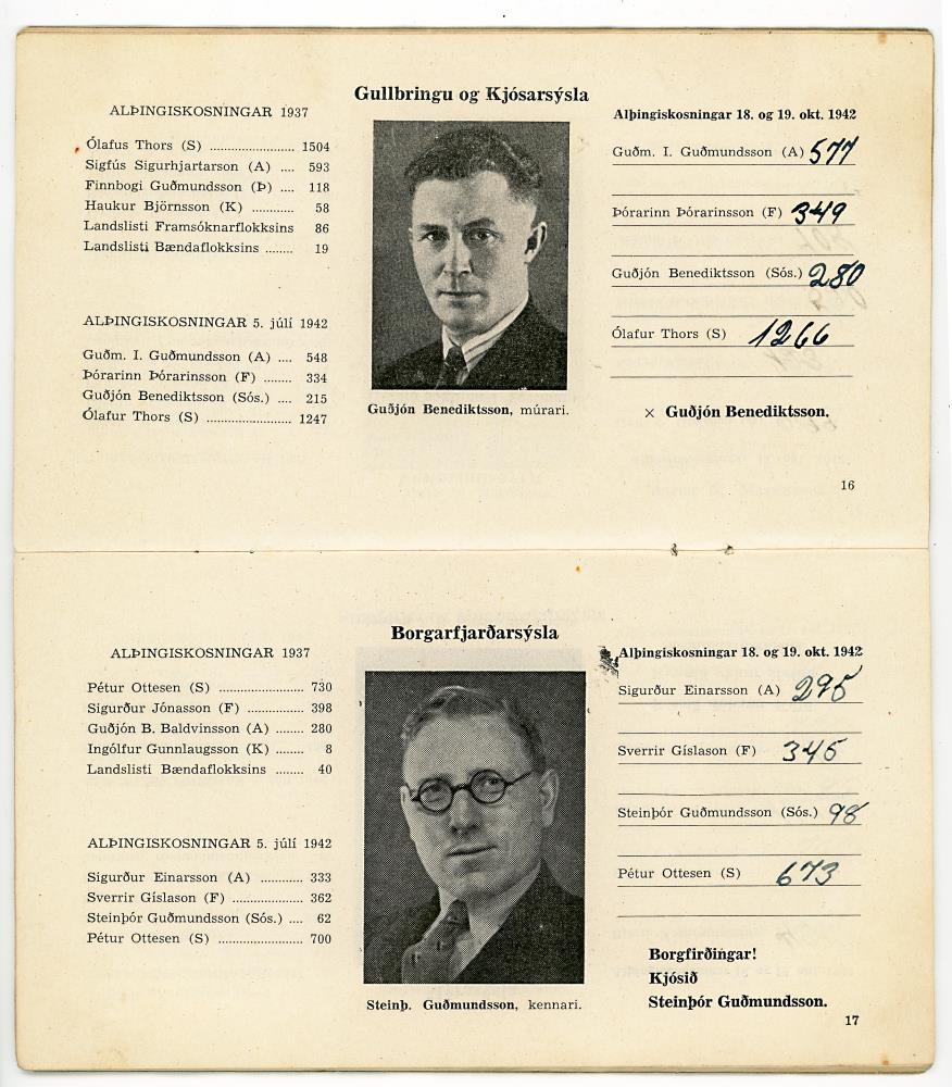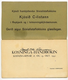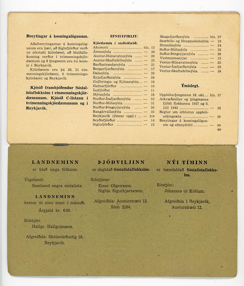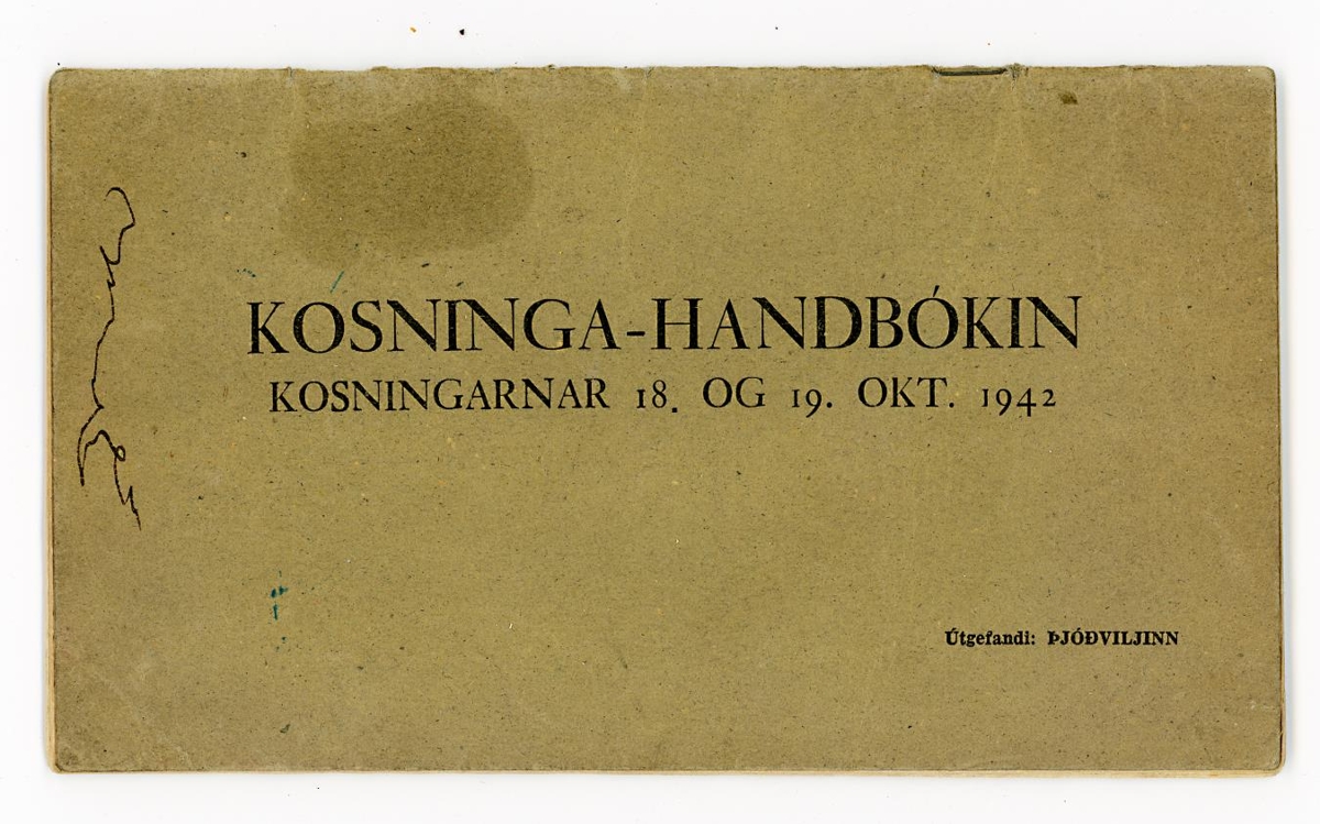 Titill: Kosninga-handbókin : kosningarnar 18. og 19. okt. 1942. - Reykjavík : Þjóðviljinn, 1942. - 40 bls. : myndir