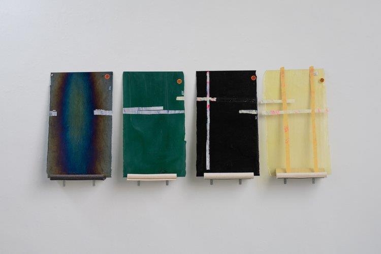 Verkið „Fjögur glerverk” er samsett úr fjórum einingum. Efniviðurinn er handdregið Bulls Eye gler með álímdum máluðum (með Maimeri polycolore og emulsion vinylique Lefranc-Bourgeois, sjá einnig viðhengi undir Skjöl) kínverskum japanspappír (sýnishorn geymt í forvörslu) límdur með polyvinyl acetat Planatol BB lím. Verkin eru staðsett á hillum og sitja á þæfðri ull.