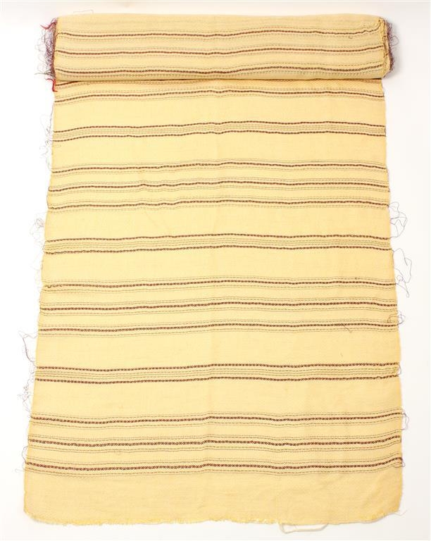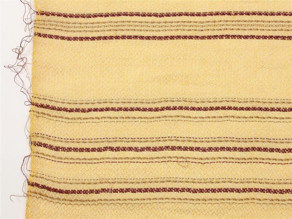 Stragni af gulu gardínuefni. Bómull í uppistöðu, ull í ívafi. Þverröndótt. Litir: gulur, rauður, brúnn og hvítur.