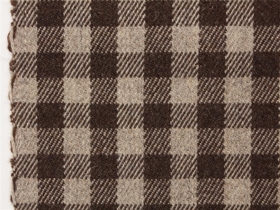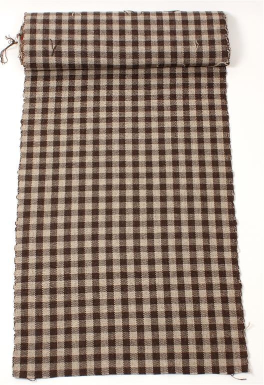 Strangi af stórköflóttu, brúnu og gráu, fremur grófu ullarefni. Litir brúnn og grár. Vaðmálsvend. Ekki hefur verið gengið frá garnendum í ívafi.
