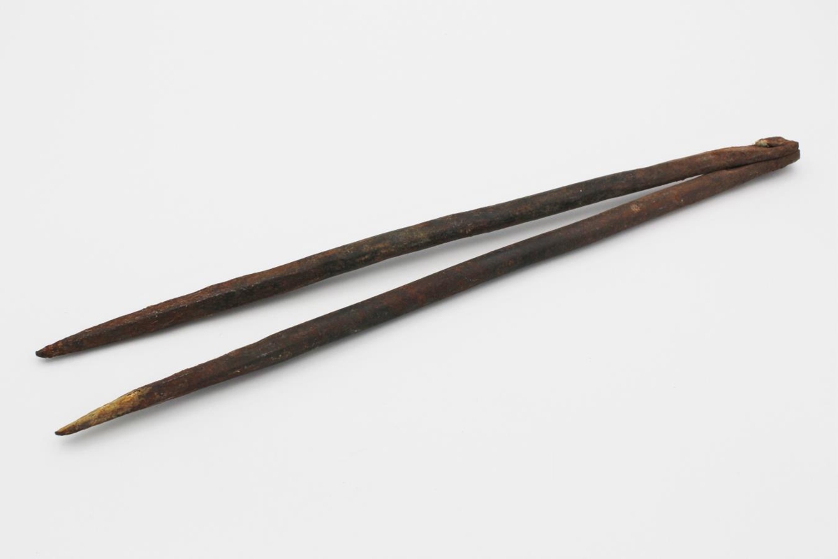 Sirkill. Smíðasirkill. Tveir járnteinar festir saman í toppinn með hnoðnagla, vel yddir að neðan. Notaður við trésmíðar, smíðaður af Magnúsi eða Sigurði Hannessonum í Hólum á Stokkseyri. Líklega smíðaður 1940-1950 að sögn Helga Ívarssonar.