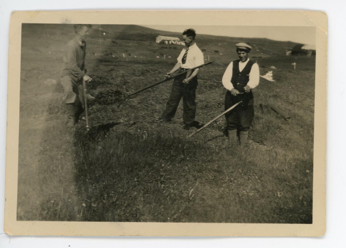 Frá vinstri. Sturla Þórðarson á Breiðabólstað, Kjartan Þorgilsson frá Knarrarhöfn og Þórður Kristjánsson bóndi á Breiðabólsstað að brýna.