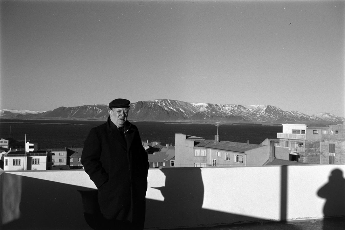 Myndirnar eru teknar á þaksvölum húss við Laugaveg, Sverrir með pípu. Esjan í bakgrunni.