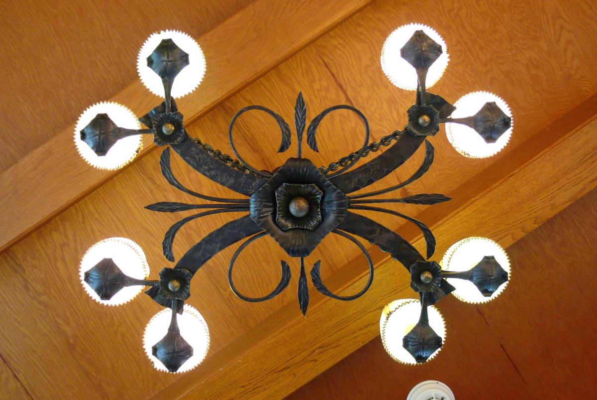 Svört ljósakróna með átta perustæðum og ljósum skermum. Endurgerð af Sveini Guðmundssyni föður Auðar.