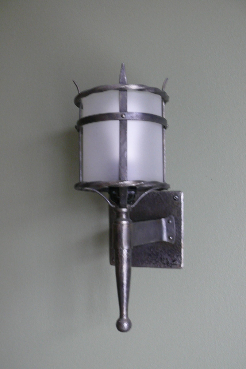 Tvö eins veggljós úr dökkum málmi. Dökkgrá með kringlóttum sandblásnum hvítum ljósakúplum og einu perustæði. Smíðuð af föður Auðar Laxness, Sveini Guðmundssyni
