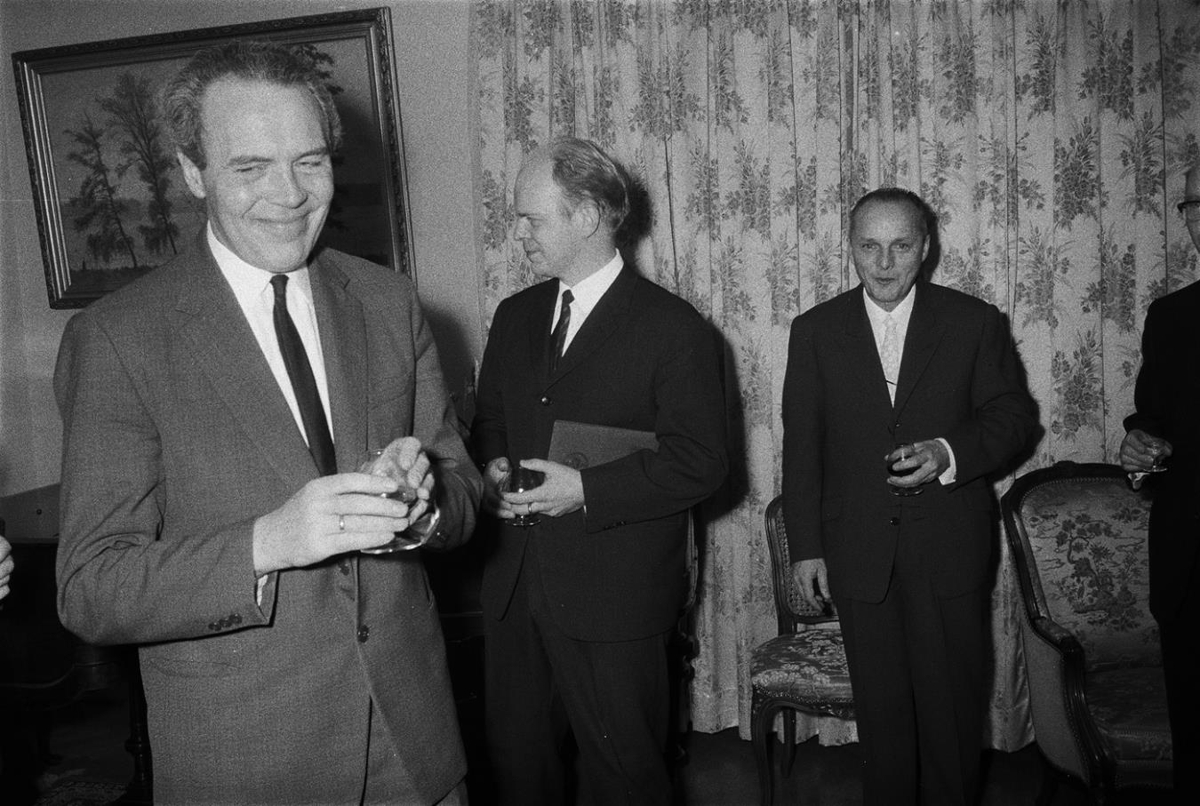 Prúðbúnir menn í móttöku eða við athöfn, m.a. Árni Bergmann.