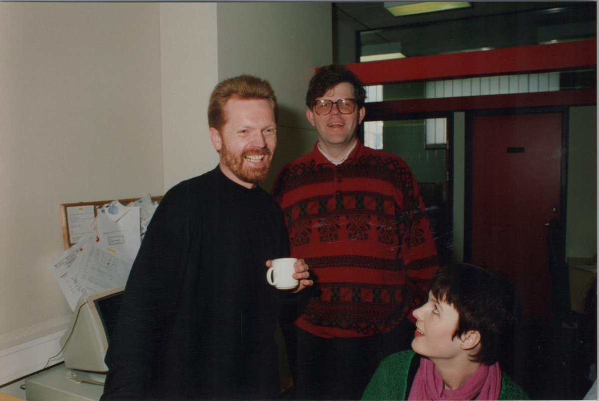 „Þetta eru Ari Skúlason, Guðmundur Gylfi Guðmundsson f. 1957 og Þórunn Birgisdóttir f. 1967 starfsmenn skrifstofu ASÍ. Myndin er tekin á skrifstofu ASí á Grensásvegi Reykjavík.“ (SÓ 2024)
