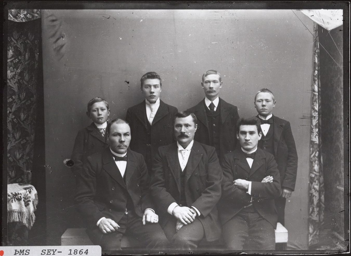 Fremst í miðju er Matthías Árnason Mathiesen skósmíðameistari, til hægri við hann er Ármann Eyjólfsson, skósmiður og trúboði í Reykjavík. Annar frá vinstri í aftari röð er Oddur Bjarnason skósmiður.