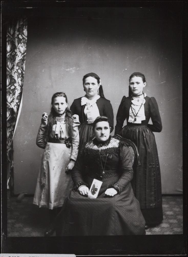 Í aftari röð f.v. eru Jóhanna Jósefína Erlendsdóttir, Ágústa Hólmfríður Jóhanna Ahrens og Ingibjörg Erlendsdóttir. Ágústa var móðir Jóhönnu og Ingibjargar. Konan sem situr er óþekkt. Hún er klædd í sparikjól og heldur á ljósmynd, á ljósmyndinni eru kona og karl.
