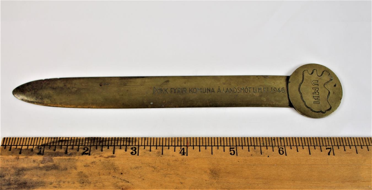 Bréfahnífur úr kopar, á honum stendur;
