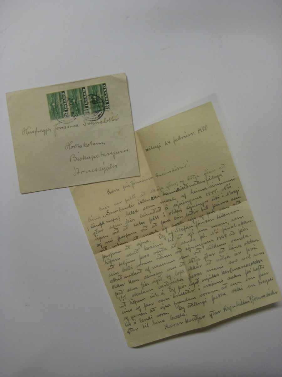 Bréfið er frá Ragnhildi í Háteigi og biður hún Jónasínu um að láta sig hafa vefnað á sýningu í Noregi.