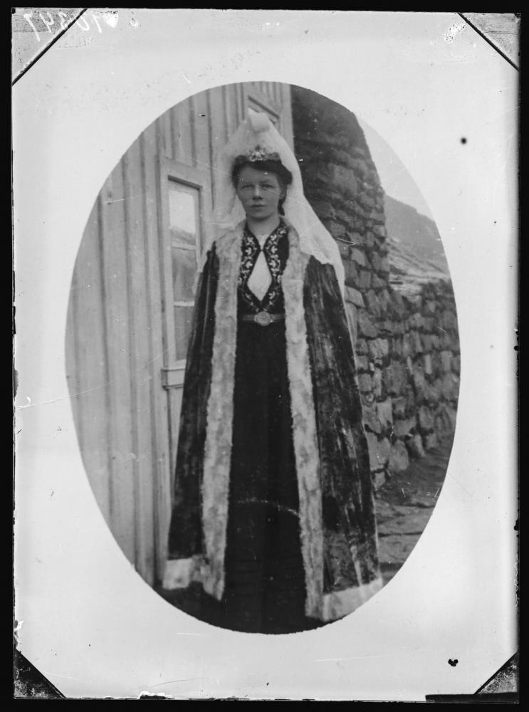 Kona á skautbúningi fyrir framan torfbæ. Eftirtaka, mögulega frá Ólafi Oddssyni, ljósmyndara. Brotin plata, hangir saman á emulsion. Merking á plötu: 10347. Ljósmyndari: Ólafur Oddsson?