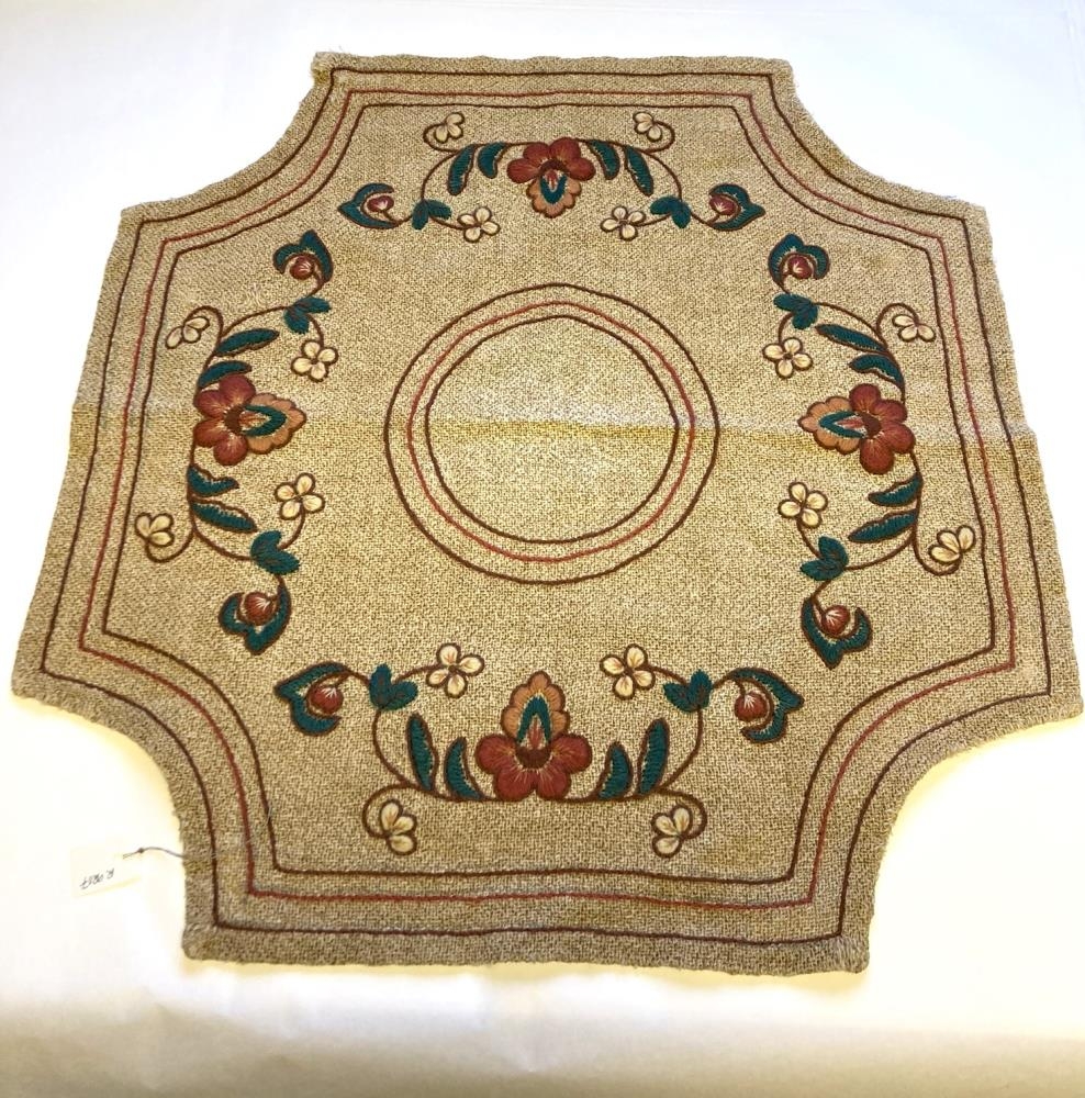 Borðdúkur úr grófum jafa. Ísaumað hringmynstur með ullargarni. Varpleggur, flatsaumur o.fl. Verk Árnýjar Filippusdóttur Skólastjóra.