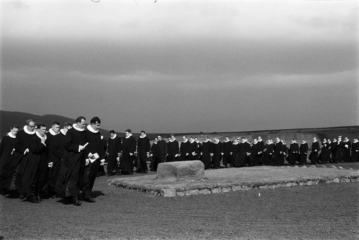 Prestar ganga fylktu liði til vígslu Skálholtsdómkirkju. Fremstir eru Ólafur Skúlason sem þá var æskulýðsfulltrúi þjóðkirkjunnar og séra Magnús Guðmundsson á Setbergi.