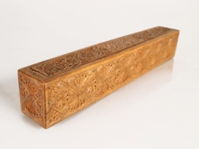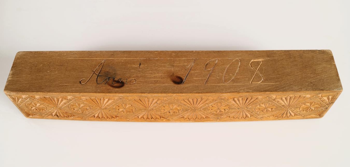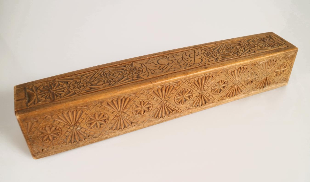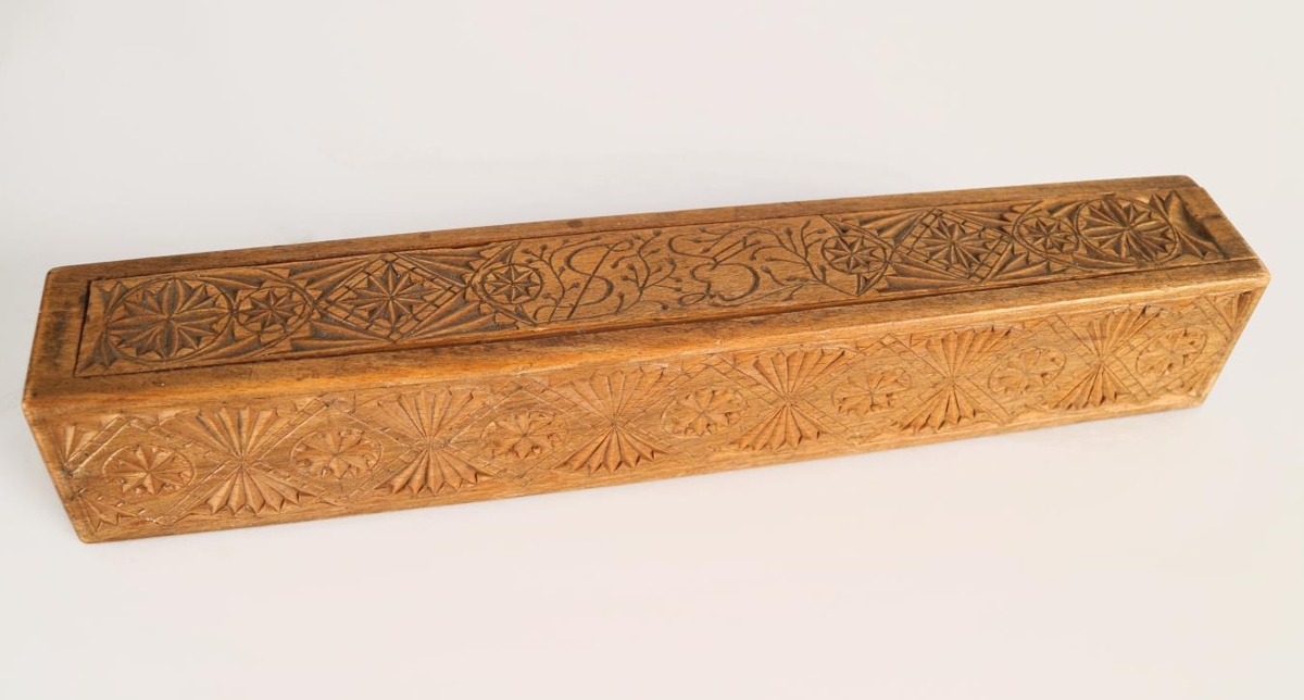Ferstrendur prjónastokkur með renniloki. Stokkurinn er útskorinn á öllum hliðum og á loki. Langhliðarnar tvær eru skreyttar samhverfum mynsturbekk; röð tígla sem mætast á hornunum, í hverjum tígli er áttblaðarós. Harmonikkumynstur er á milli tíglanna. Svipað mynstur er á loki stokksins; fjórar rósir eða stjörnur með mismörgum örmum/blöðum á sitt hvorum enda, í miðju lokinu er fangamark umvafið greinastrengjum: SGD. Á botni stokksins er útskorið "Anno 1908". Prjónastokkurinn er í góðu ástand, en hefur bólgnað eilítið út fyrir miðju.