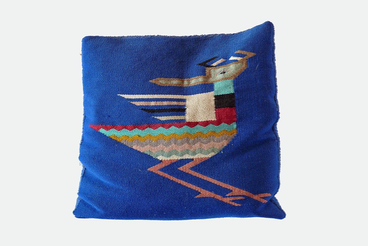 Blár púði með kynjafugli, munstrið er á fuglinum er brúnt, svart, hvítt, lilla, blátt, bleikt, gult, grátt og rautt. Um er að ræða einn af fimm svipuðum púðum. Upphaflega fékk Auður refil sendan frá konu en hún ákvað að klippa hann í sundur þar sem hún sá ekki fram á að hafa pláss fyrir hann og bjó í staðinn til fimm púða úr honum.
