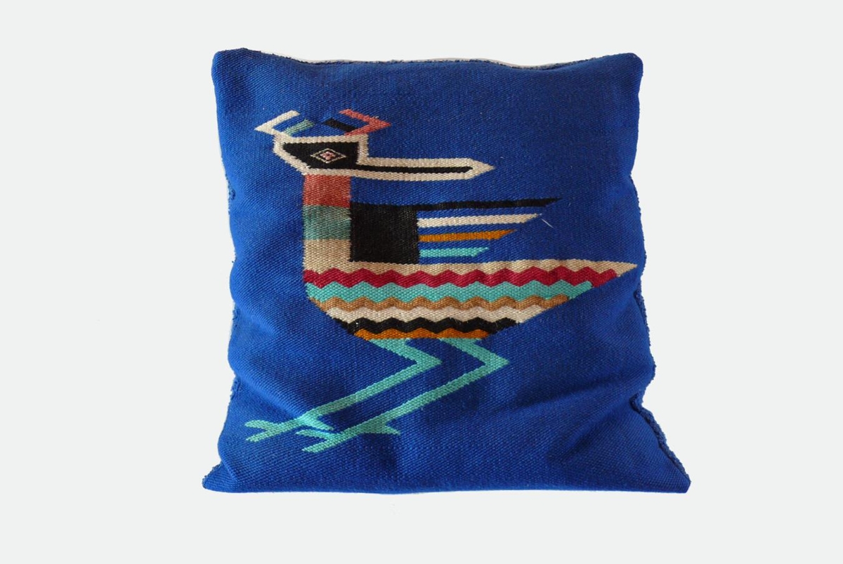 Blár púði með kynjafugli, munstrið er á fuglinum er brúnt, svart, hvítt, lilla, blátt, bleikt, gult, grátt og rautt. Um er að ræða einn af fimm svipuðum púðum. Upphaflega fékk Auður refil sendan frá konu en hún ákvað að klippa hann í sundur þar sem hún sá ekki fram á að hafa pláss fyrir hann og bjó í staðinn til fimm púða úr honum.