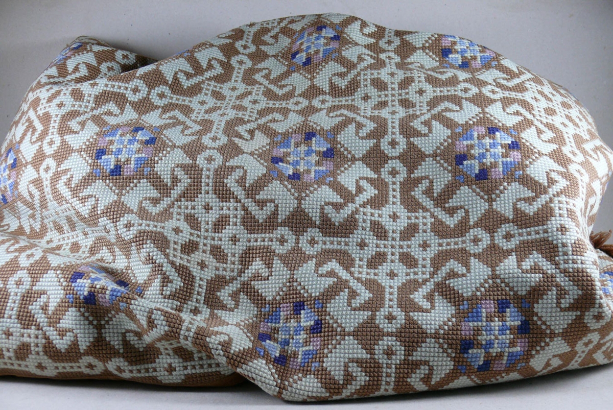 Útsaumaður púði með munstri af ferningum og krossum. Inn í miðjum ferningunum eru bláir og fjólubláir krossar. Lítið kögur á langendum og einlitt brúnt efni að aftan.