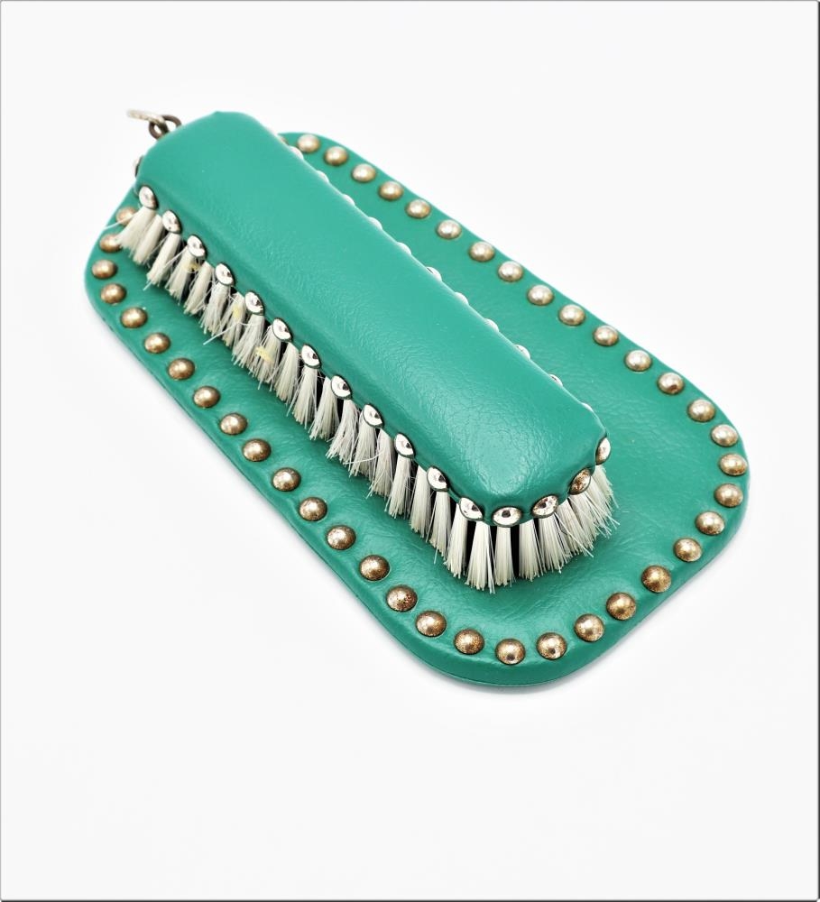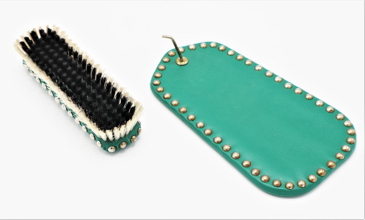 Fatabursti sem hangir á platta. Platti klæddur grænu plasti og skreyttur með málmbólum. Burstinn er eins útbúinn.