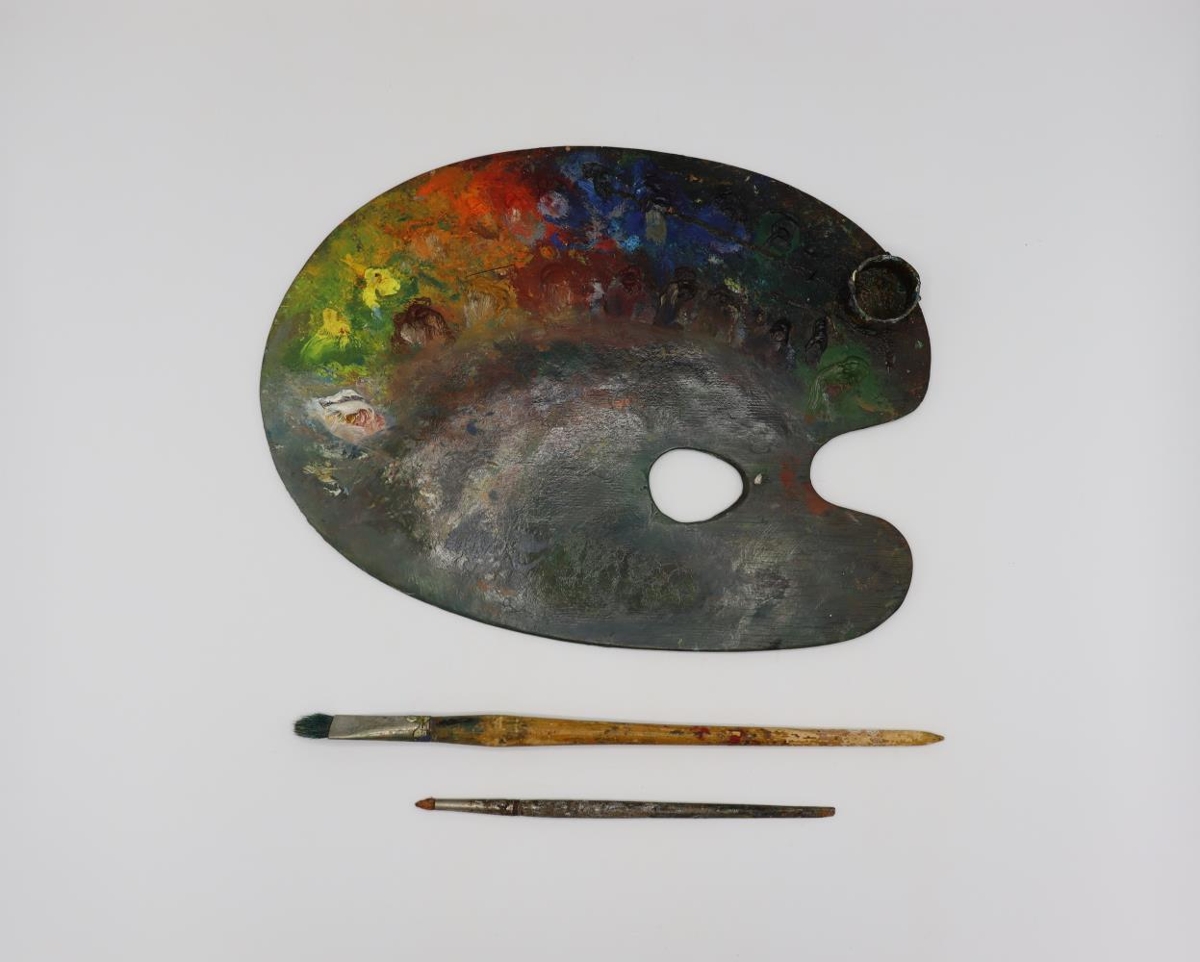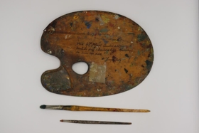 Notað málaraspjald og tveir penslar frá Júlíönu Sveinsdóttur. Aftan á spjaldi stendur: ,,Denne palet har tilhört malerinden Juliana Sveinsdóttir. Min far Carl Andreassen hentede den i hendes hus i Horneby, da hun var död" Inge Krog.