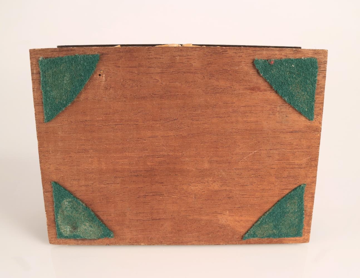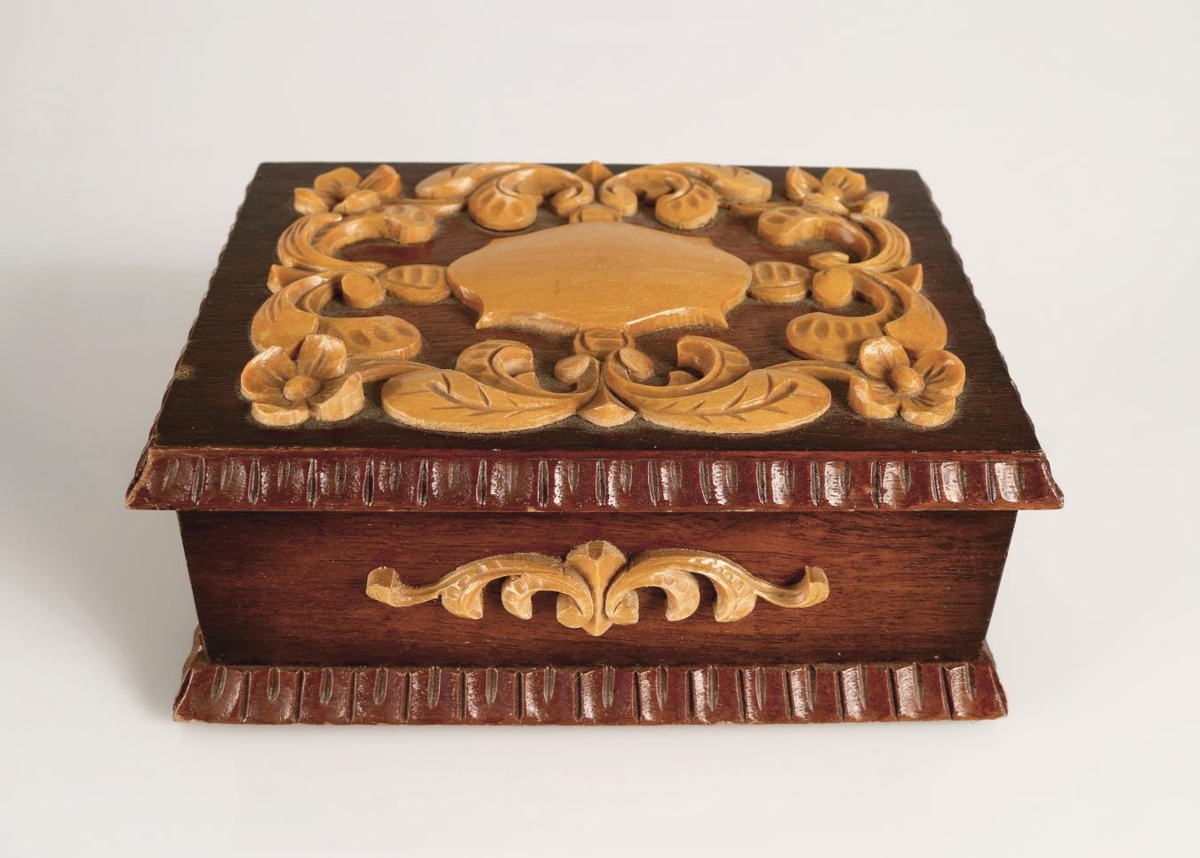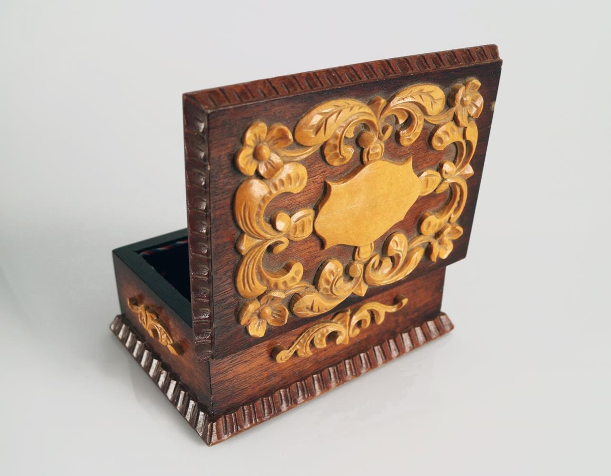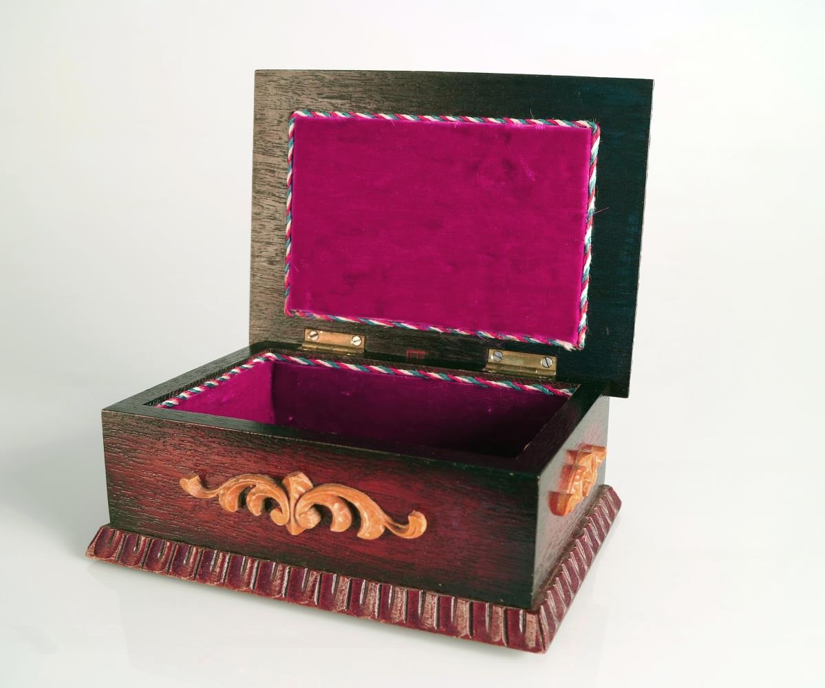 Smástokkur / askja úr dökkum viði, mögulega mahóní. Stokkurinn er lakkaður á öllum hliðum nema á botni. Á hliðum hans og loki eru álímdir skrautsveigar úr ljósum viði. Fyrir miðju loksins er skjöldur og frá honum liggja laufasveigar, fjögurra blaða blóm er í hverju horni. Fjórir grænir filtpúðar eru undir botni stokksins, einn í hverju horni. Stokkurinn er klæddur með fjólubleiku flaueli að innan, bæði í botni og í loki. Umhverfis flauelið eru þrír tvinnar sem snúnir hafa verið saman, blár, rauður og hvítur. Stokkurinn er 15 cm á lengd, 11 cm á breidd og 6 cm á hæð. Stokkurinn virðist ekki ýkja gamall, líklega er hann frá tímabilinu 1940-1970.