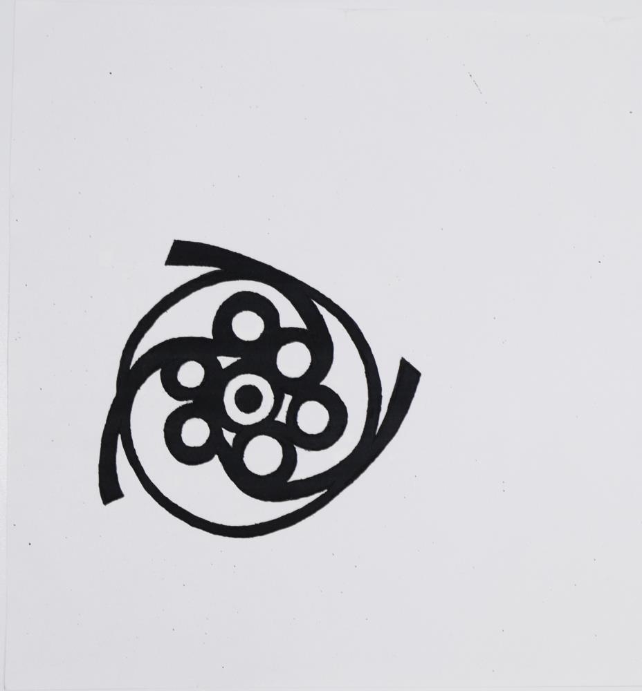 Táknskissa, form úr hringjum og sveigðum línum sem hverfast um hring fyrir miðju. Blaðið er merkt "ORG40"