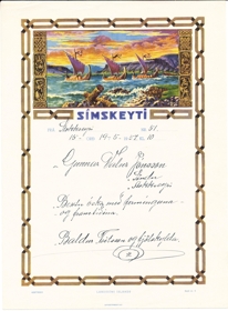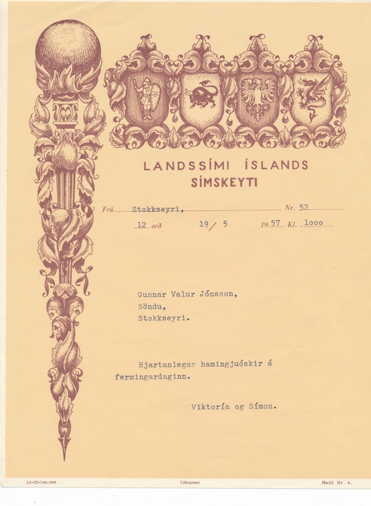 Fermingarskeyti og kort frá 1957. Baldur Teitsson var símstöðvarstjóri og Guðmundur Sigurðsson ( frá Hvanneyri ?) var oftlega fenginn til að handskrifa skeytin vegna þess hve vel hann skrifaði.