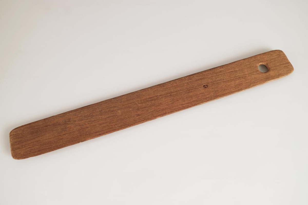 Flöt og aflöng viðarspýta. Gat er í gegnum hana við annan endann. Rendur spýtunnar eru litaðar af blýir, hefur hún því að öllum líkindum verið notuð sem reglustika. Reglustikan er 31,3 cm að lengd og 3,6 cm að breidd. Hún er líklega frá fyrri hluta 20. aldar.