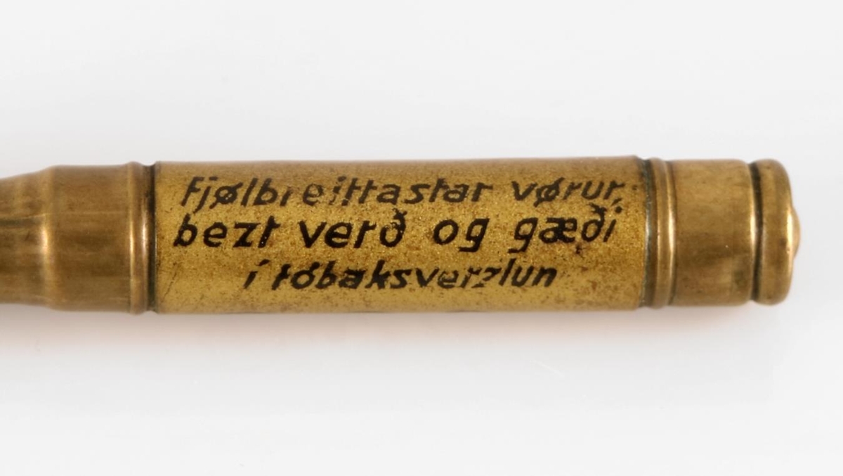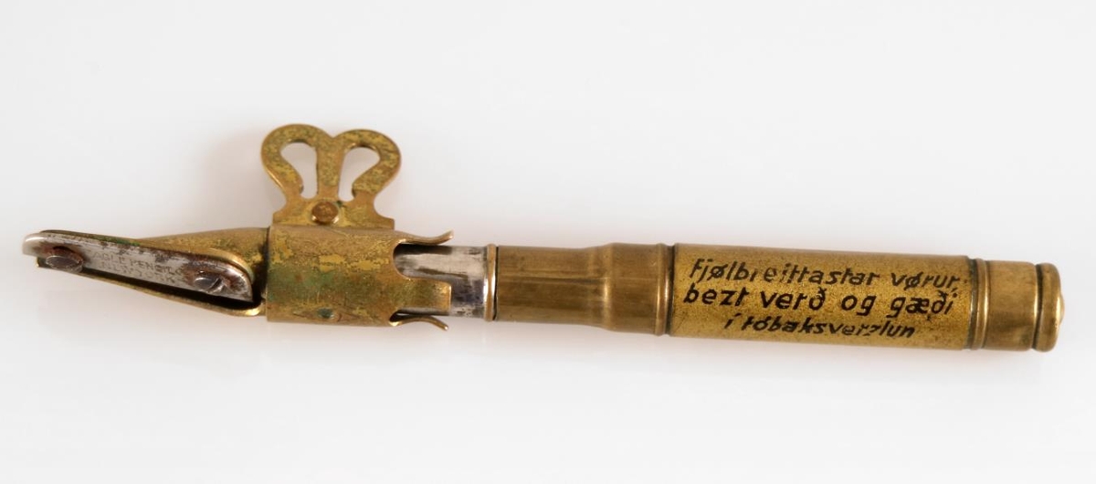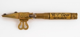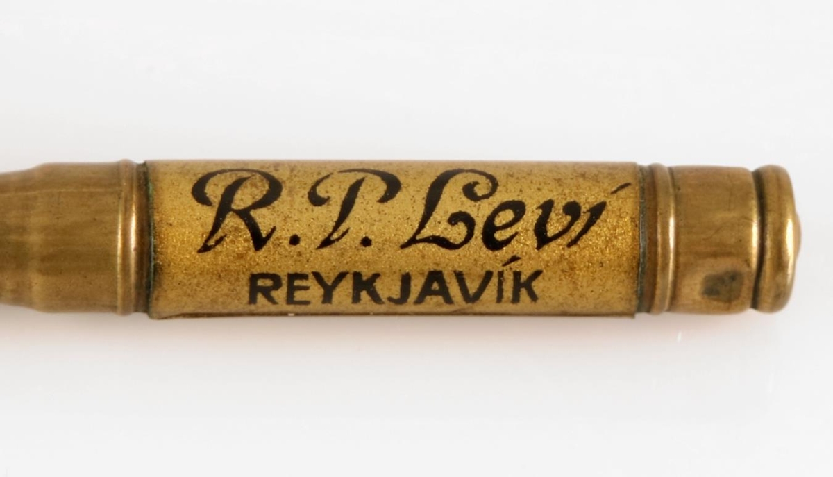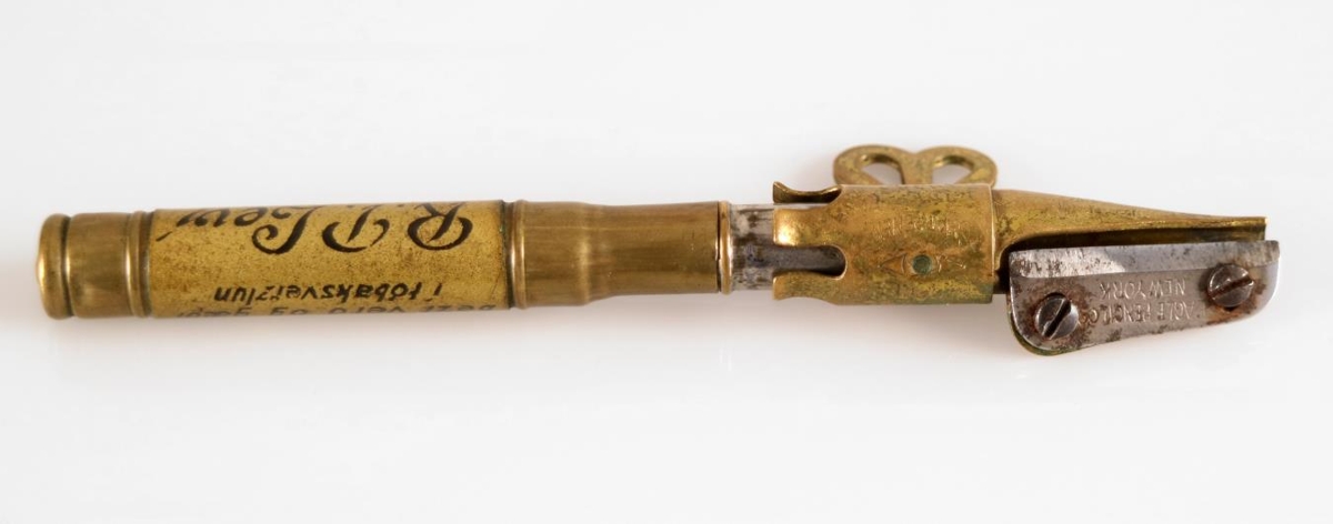 Aflangur yddari úr látúni með holu skafti. Hann er 11,5 cm á lengd. Yddarinn er merktur Simplex sharpener No. 650 frá framleiðandanum Eagle Pencil Co. sem starfaði í New York. Á handfanginu stendur með svörtu letri: "Fjølbreittastar vørur, bezt verð og gæði í tóbaksverzlun R. P. Leví REYKJAVÍK". Tóbaksverzlun R. P. Leví hóf starfsemi árið 1909. Yddarinn er því frá árunum 1909 til 1924, en um það leyti hætti R. P. Leví rekstri verslunarinnar.