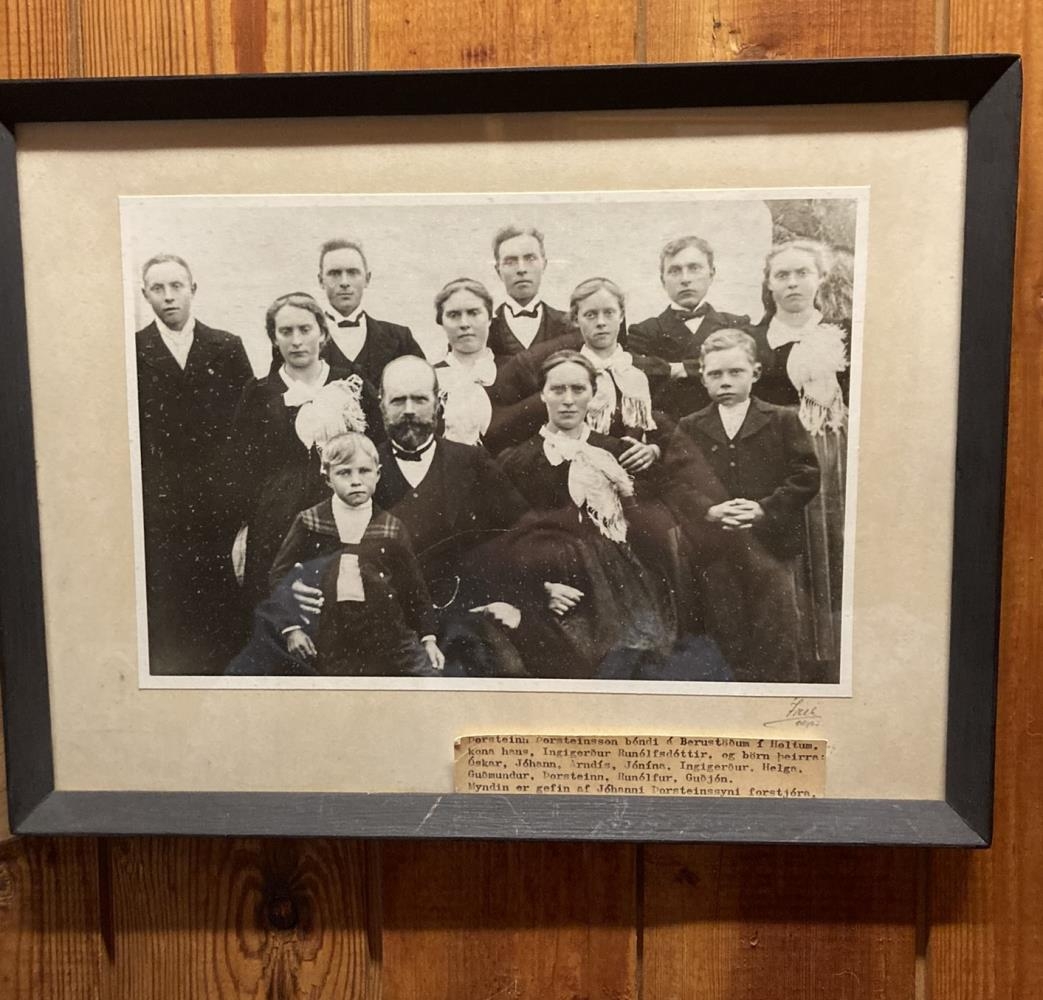 Innrömmuð ljósmynd; Þorsteinn Þorsteinsson f. 1857-1943 og Ingigerður Runólfsdóttir 1858-1934, bændur á Berustöðum í Holtum ásamt börnum sínum; Óskar, Jóhann, Arndís, Jónína, Ingigerður, Helga, Guðmundur, Þorsteinn, Runólfur og Guðjón. Myndin er gefin af Jóhanni Þorsteinssyni.