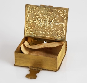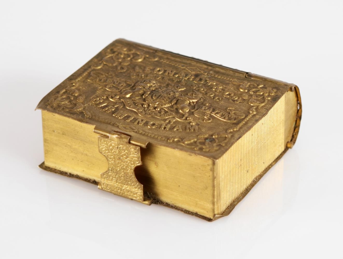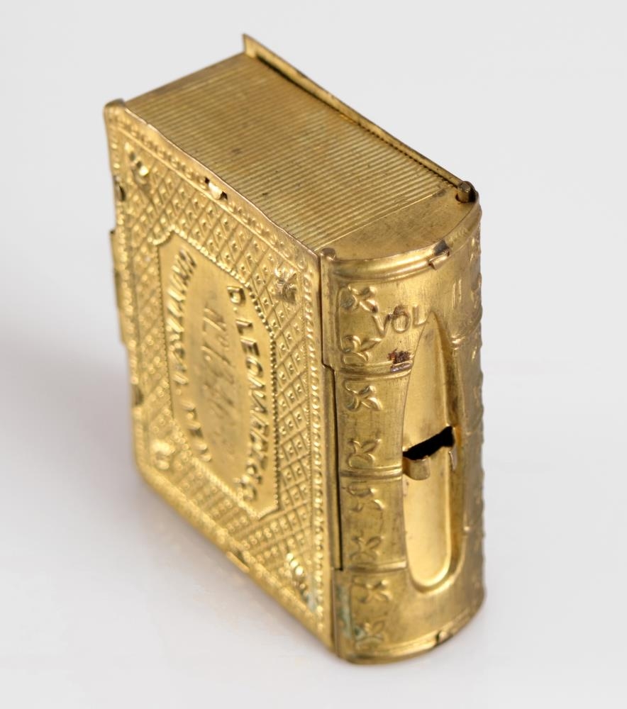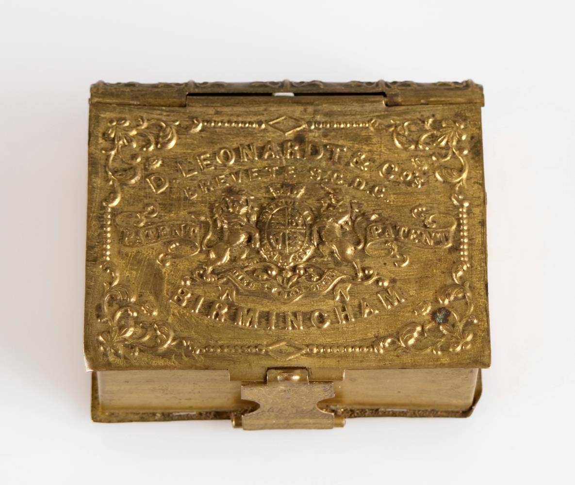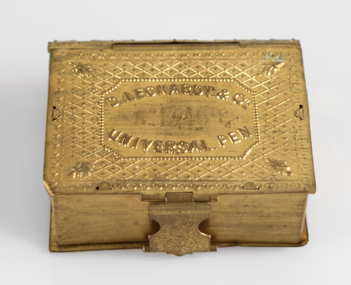 Gyllt blikkdós / askja / box undir penna. Dósin er bókarlaga, upphleypt mynstur skreytir botn, lok og kjöl. Á miðju loki dósarinnar er skjaldarmerki ensku krúnunnar. Þar fyrir ofan stendur: "D. LEONARDT & CO'S / BREVETTE S.C.D.C." Fyrir neðan skjaldarmerkið stendur: "BIRMINGHAM". Á botni stendur: "D. LEONARDT. & COS / NO 1346-F / UNIVERSAL. PEN". Efst á kilinum stendur "VOL II", þar fyrir neðan er dæld með hafti þar sem stungið er penna. Hespa er á miðri framhlið sem krækt er í gat á frambrún á loki.