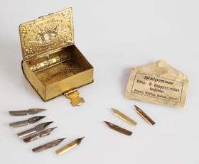 Blikkdósin, pennarnir og umslagið sem þeir eru í eru líklega frá fyrri hluta 20. aldar.