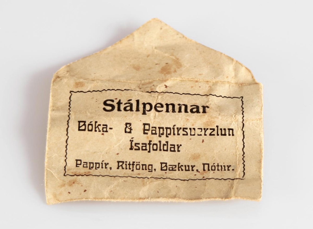 Í dósinni eru níu pennar fyrir pennastangir, af mismunandi gerð og frá ólíkum framleiðendum. Þrír þeirra eru framleiddir af D. Leonardt & Co., tveir af Macniven & Cameron Ltd., tveir af C. Brandauer & Co. og einn af Heintze & Blanckertz. Þá er einn merktur "EISENBAHN / FEDER". Smágert umslag er í öskjunni, á það er prentað með svörtu letri: "Stálpennar / Bóka- & Pappírsverzlun Ísafoldar / Pappír, Ritföng, Bækur, Nótur."