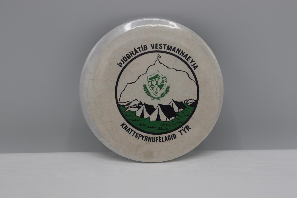 5,5 cm í þvermál, þjóðhátíðarmerki. Áletrun: Þjóðhátíð Vestmannaeyja. Knattspyrnufélagið Týr.