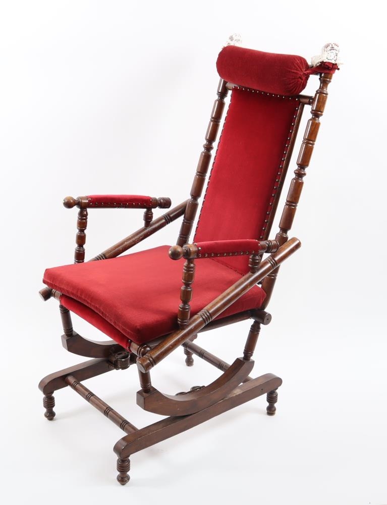 Bólstraður ruggustóll með með háu bólstruðu baki og bólstruðum örmum. Áklæði er vínrautt að lit. Einkennandi eru renndir pílárar í baki og örmum. Aldur og uppruni óviss.