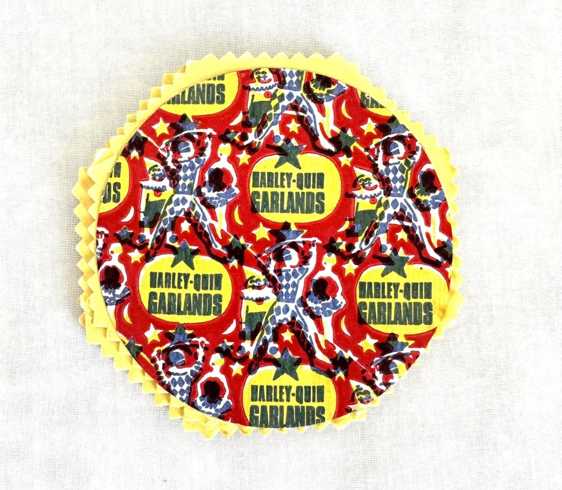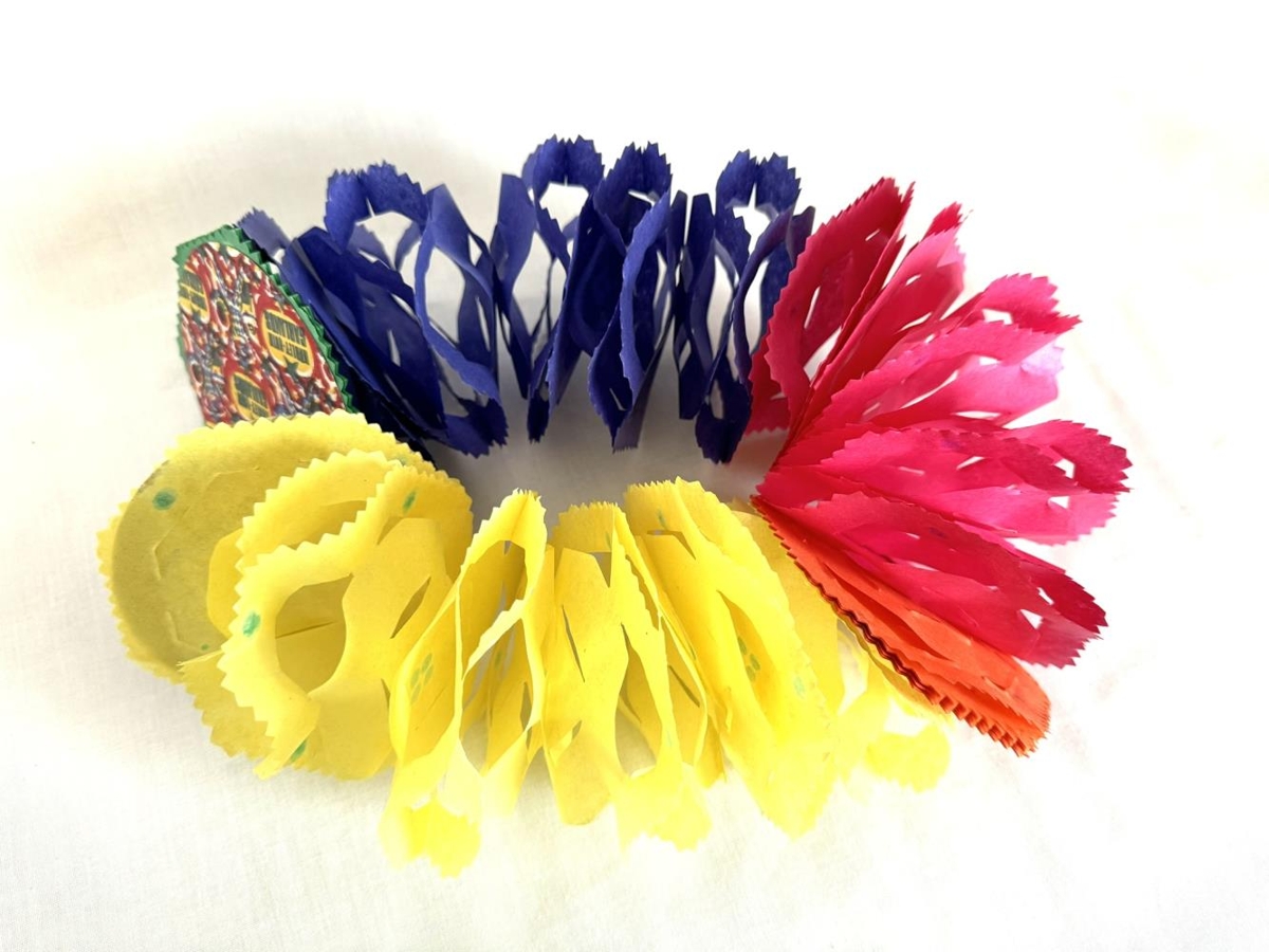 Loftskraut, jólaskraut frá heimili foreldra gefenda. Hringlaga form og svo er dregin út lengja í mörgum litum.