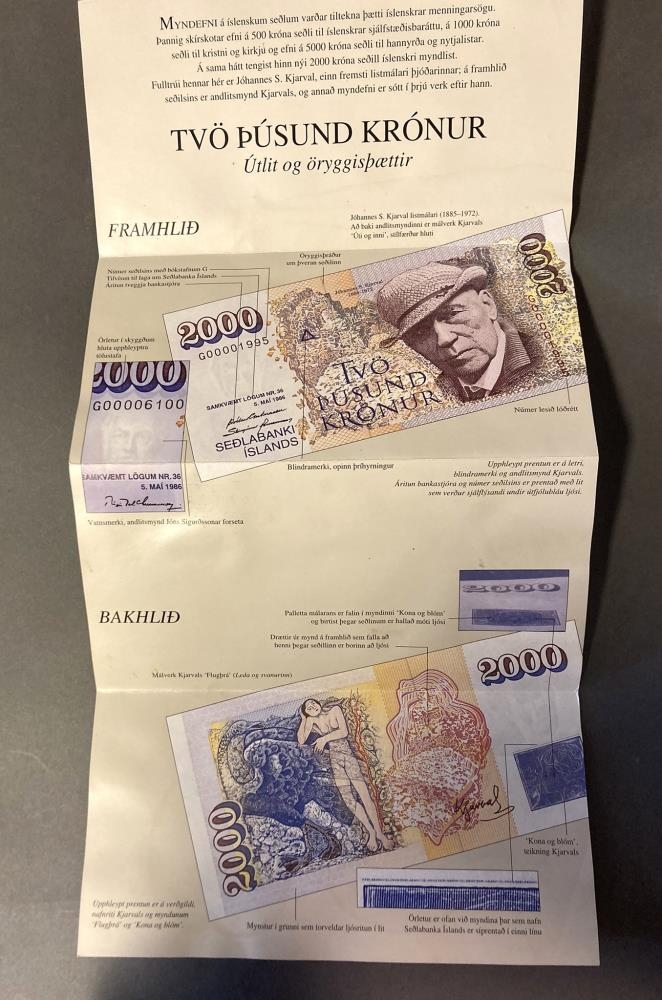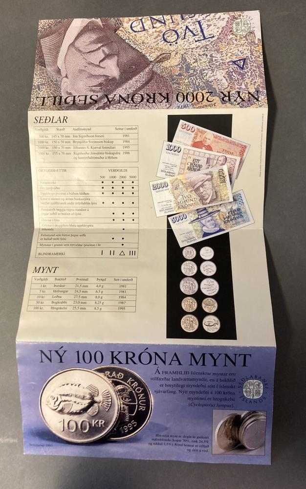 Kynningarbæklingur Seðlabanka Íslands um nýjan tvö þúsun króna seðil og nýja 100 króna mynt. Nóvember 1995.