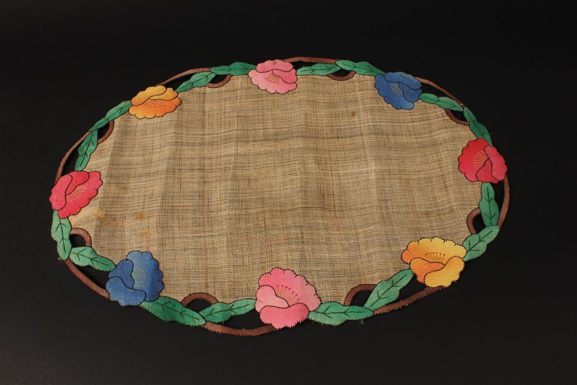 Strigadúkur eða diskamotta með ásaumuðum, applíkeruðum, blómum í ýmsum litum.