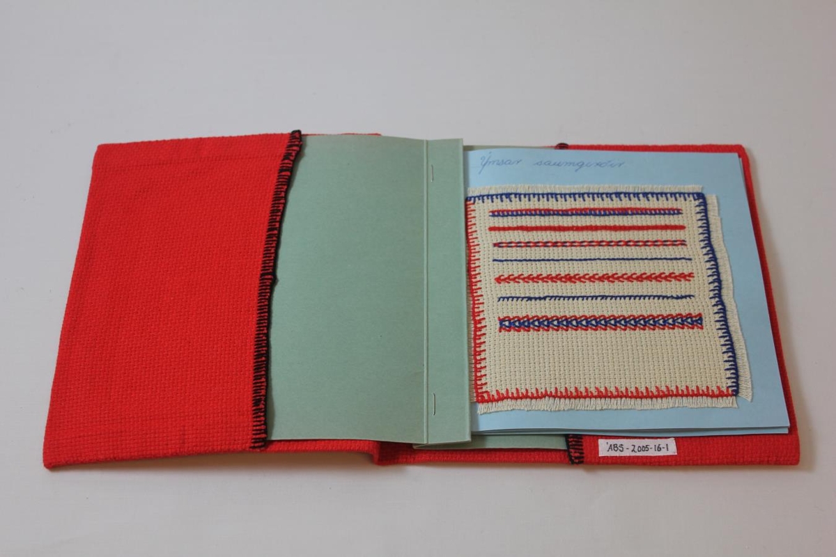 Skólahandavinna frá því í 12. ára bekk Hlíðaskóla, árið 1965. Prufubók sem sýnir ýmsar saumgerðir. Klædd með rauðum bómullarjava, útsaumur; munstur og upphafsstafir: GG. 1965. Prufubækur sem þessar voru mjög algeng skylduverkefni í handavinnu stúlkna á þessum árum.