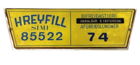 Hreyfils skilti, bifreiðastjóri númer 74. Svartir stafir á gulum bakgrunni. Áletrun:" HREYFILL" og "HREYFILL SÍMI 85522. BIFREIÐASTJÓRI HARALDUR SIGFÚSSON AFGREIÐSLUNÚMER 74".