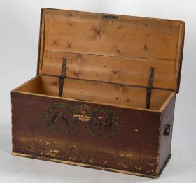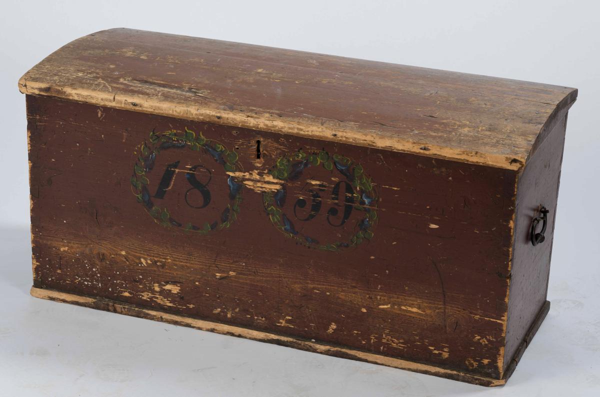 Brúnmáluð kista úr viði með kúptu loki. Kistan er 103 cm á lengd og 49 cm á breidd. Mesta hæð hennar er 51 cm. Skráargat er á kistunni en enginn lykill fylgir. Framhlið kistunnar er skreytt tveimur máluðum blómakrönsum, grænum með bláum blómum. Innan þeirra er ártalið 1859 málað í svörtu letri. Handfang úr málmi er á sitt hvorri skammhlið kistunnar. Kistan er í sæmilegu ástandi, en málning er víða farin að flagna af, sérstaklega á loki hennar.
