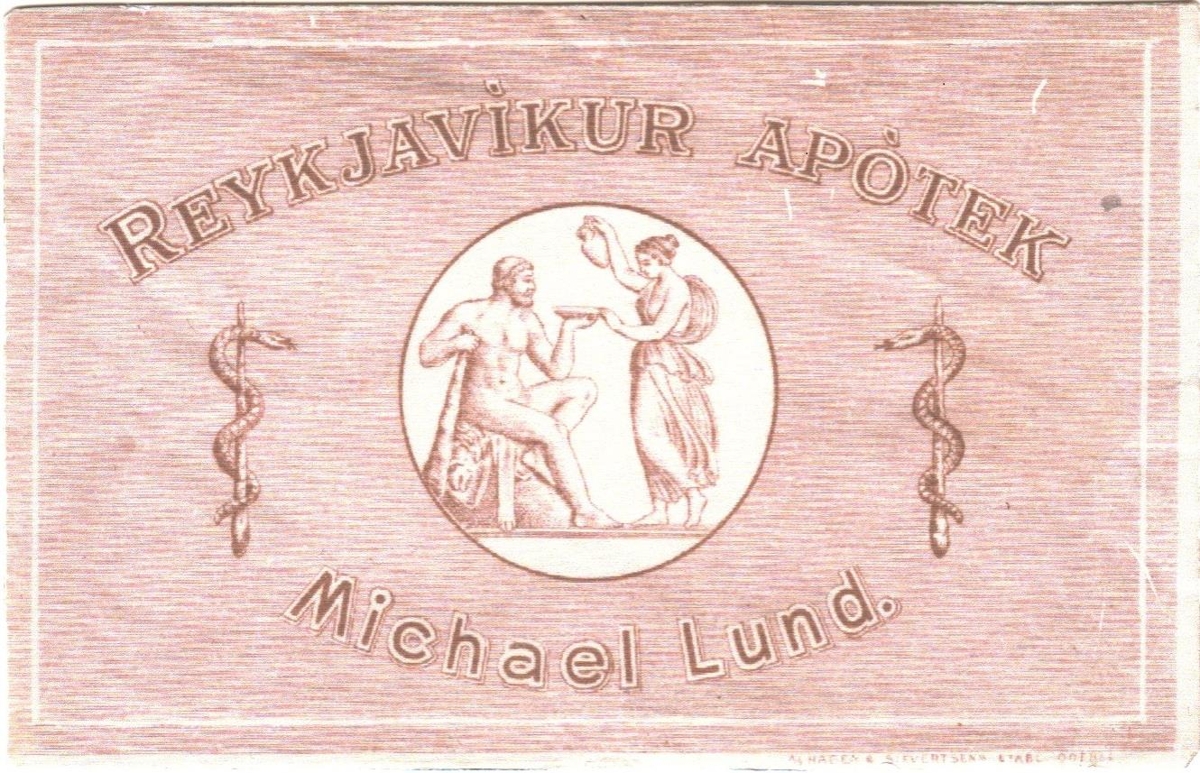 Á umslaginu stendur Reykjavíkur Apótek og nafnið Michael Lund. Michael Lund (10.6.1873-8.8.1949) var apótekari í Reykjavíkur Apóteki á árunum 1899-1911.