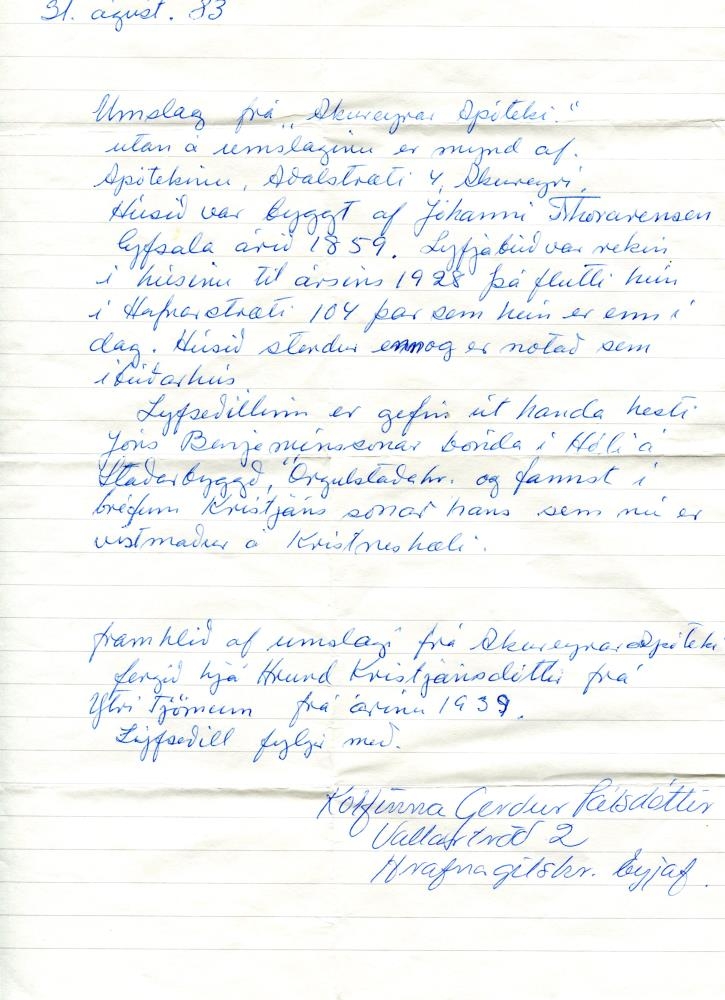 Á umslaginu er mynd af húsinu Aðalstræti 4 á Akureyri, en þar var apótekið til 1928 er það flutti að Hafnarstræti 104. Nánari upplýsingar eru í bréfi sem fylgir með sem ljósrit. Auk þess er mynd af bakhlið umslagsins og þar eru taldar upp ýmsar vörur sem voru til sölu.