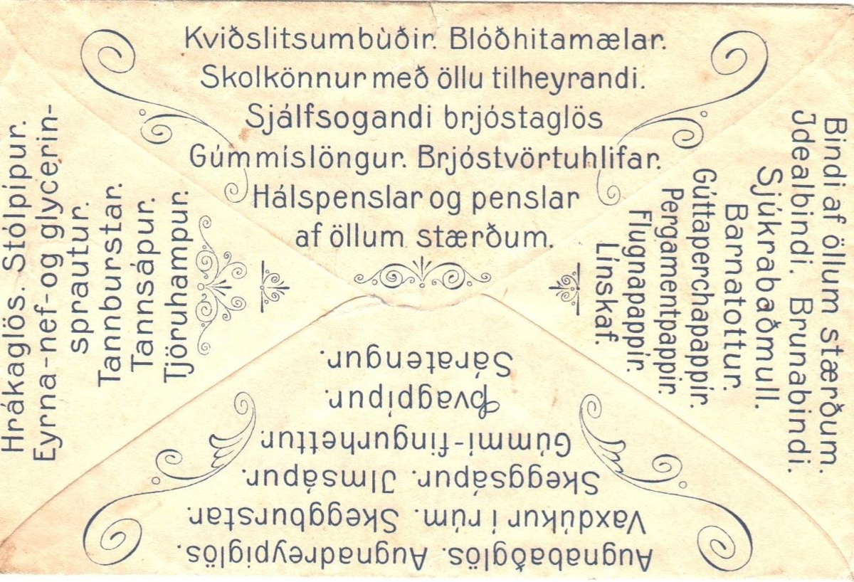 Á bakhlið umslagsins eru taldar upp ýmsar vörur sem voru til sölu í apótekinu.