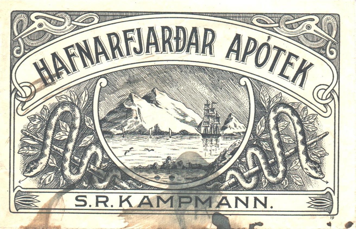 Á umslaginu er nafnið Hafnarfjarðar Apótek í boga yfir teikningu af háu fjalli við fjörð og skútu á siglingu. Umhverfis myndina eru slöngur og laufblöð og neðst stendur S. R. Kampmann, en Sören Ringsted Jensen Kampmann (13.12.1884-17.4.1957) var stofnandi og fyrsti apótekari 1918-1947.
