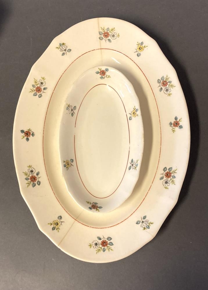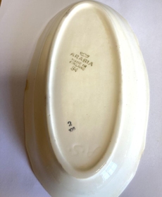 Tveir sporöskjulaga diskar, steikarfat 36x25 sm og smádiskur 21,5x12 sm. Hvítir með fíngerðu blómamynstri og rauðri línu. Merking: Arabia, Made in Finland 34; 2-108, A.S. (Aune Siimes ?)