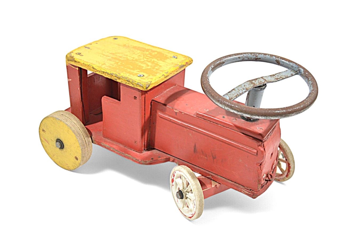 Sparkbíll með stýri. Leikfang í leikskóla. Bíll sem hægt er að sitja á og sparka sig áfram.