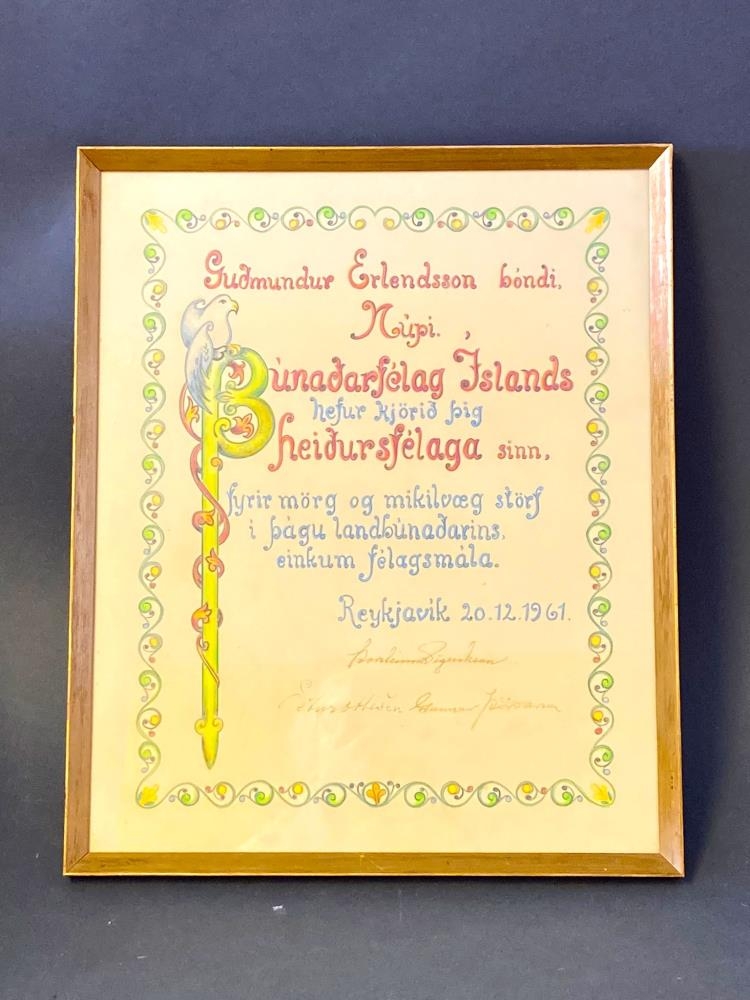 Heiðursskjal innrammað. Guðmundur Erlendsson bóndi, Núpi. Búnaðarfélag Íslands hefur kjörið þig heiðursfélaga sinn, fyrir mörg og mikilvæg störf í þágu landbúnaðarins, einkum félagsmála. Reykjavík 20.12.1961. Undirritað af Þorsteini Sigurðssyni, Gunnari Þórðarsyni og ?.